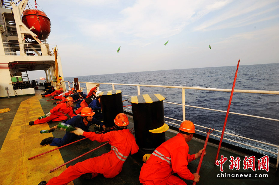 有特戰(zhàn)隊員在身邊,增強了船員反海盜信心。圖為演練時,船員進行投擲啤酒瓶訓(xùn)練。江山 攝