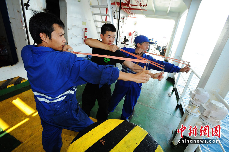 特戰(zhàn)隊員杜磊(中)給船員傳授自制皮彈弓的使用技巧。該船自制皮彈弓20把,并用螺絲、彈珠和自制短鋼筋作子彈,作為防御海盜的土武器之一。江山 攝