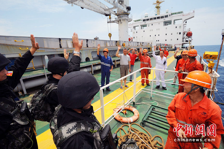 4月16日上午11時,商船被護送到安全海域。特戰(zhàn)隊員離船之際,船員們依依不舍地向特戰(zhàn)隊員揮手告別。江山 攝