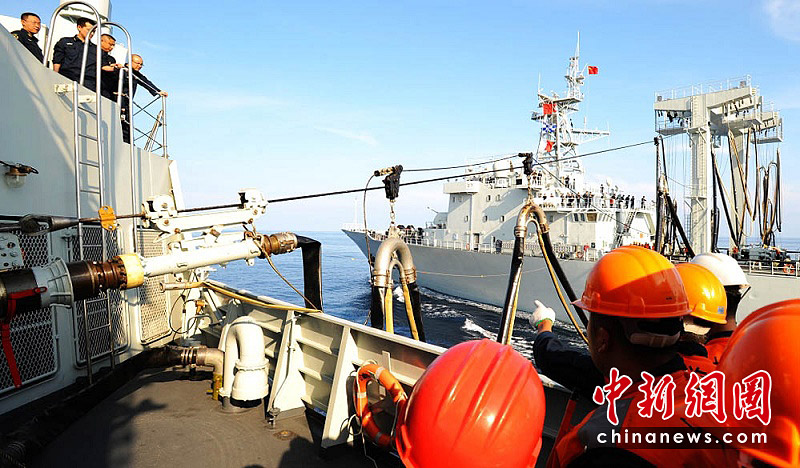 3月9日上午,第五批護(hù)航編隊(duì)在印度洋進(jìn)行了首次海上補(bǔ)給!拔⑸胶本C合補(bǔ)給艦對(duì)“廣州”號(hào)導(dǎo)彈驅(qū)逐艦進(jìn)行了橫向的液貨補(bǔ)給。江山 攝