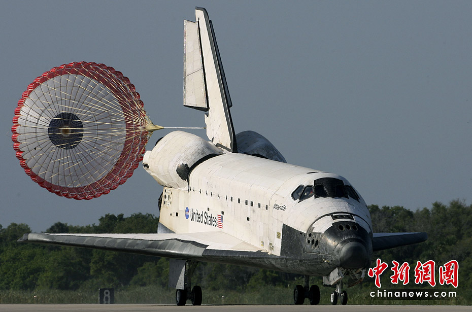 當(dāng)時時間5月26日上午8點48分,美國航天飛機“亞特蘭蒂斯”號順利降落在佛羅里達(dá)州肯尼迪航天中心。這是“亞特蘭蒂斯”號的最后一次任務(wù)。美國現(xiàn)役3架航天飛機——“亞特蘭蒂斯”號、“奮進(jìn)”號和“發(fā)現(xiàn)”號將于今年全部退役。圖片來源:中國新聞網(wǎng)