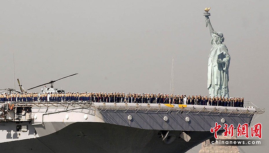 當?shù)貢r間5月26日,美國第23屆紐約艦隊周開幕,包括“硫磺島”號兩棲攻擊艦在內(nèi)的11艘參加艦隊周活動的軍艦由南向北在哈得孫河面上游弋。紐約民眾將以停靠在曼哈頓哈得孫河86號碼頭的“無畏號”航母博物館為中心,展開為期一周的慶祝和紀念活動。圖片來源:中國新聞網(wǎng)