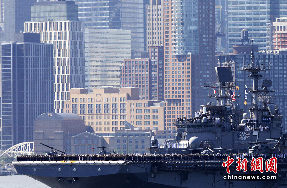 當(dāng)?shù)貢r(shí)間5月26日,美國(guó)第23屆紐約艦隊(duì)周開幕,包括“硫磺島”號(hào)兩棲攻擊艦在內(nèi)的11艘參加艦隊(duì)周活動(dòng)的軍艦由南向北在哈得孫河面上游弋。紐約民眾將以?吭诼D哈得孫河86號(hào)碼頭的“無畏號(hào)”航母博物館為中心,展開為期一周的慶祝和紀(jì)念活動(dòng)。圖片來源:中國(guó)新聞網(wǎng)