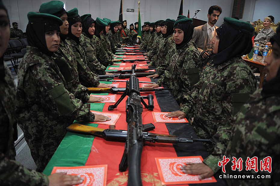 當(dāng)?shù)貢r(shí)間5月27日,阿富汗首批女軍官在首都喀布爾舉行畢業(yè)宣誓儀式。這是阿富汗軍隊(duì)征召女兵計(jì)劃的一部分,按照計(jì)劃她們將根據(jù)各自受教育程度被賦予不同的職位:接受過12年以上教育的女兵將擔(dān)任文職官;接受過9年到11年教育的將擔(dān)任軍士長(zhǎng);受教育程度更低的女兵則只能當(dāng)列兵。圖片來源:中國(guó)新聞網(wǎng)