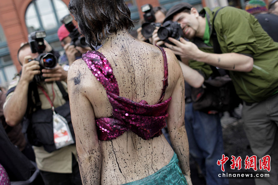 5月28日,美國環(huán)保主義者在紐約曼哈頓的一家加油站前,身上涂灑黑色顏料,以此抗議墨西哥灣原油不斷泄露。