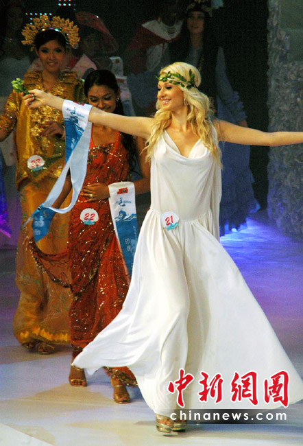 5月29日晚,第35屆國際比基尼小姐全球總決賽在三亞“美麗之冠”落下帷幕,22歲的羅馬尼亞選手Diana Irina Boanca摘得冠軍?倹Q賽還評選出了四季小姐,18歲的中國選手趙茜獲得“秋季小姐”,澳大利亞、委內(nèi)瑞拉和拉脫維亞選手分別獲得春、夏、冬季小姐。共有來自世界各地的64位佳麗參加了總決賽的角逐。當晚,佳麗們展示了各自國家或地區(qū)特色的民族服飾,用不同的方式展示了不同風格的比基尼“秀”,性感迷人。 中新社記者 尹海明攝