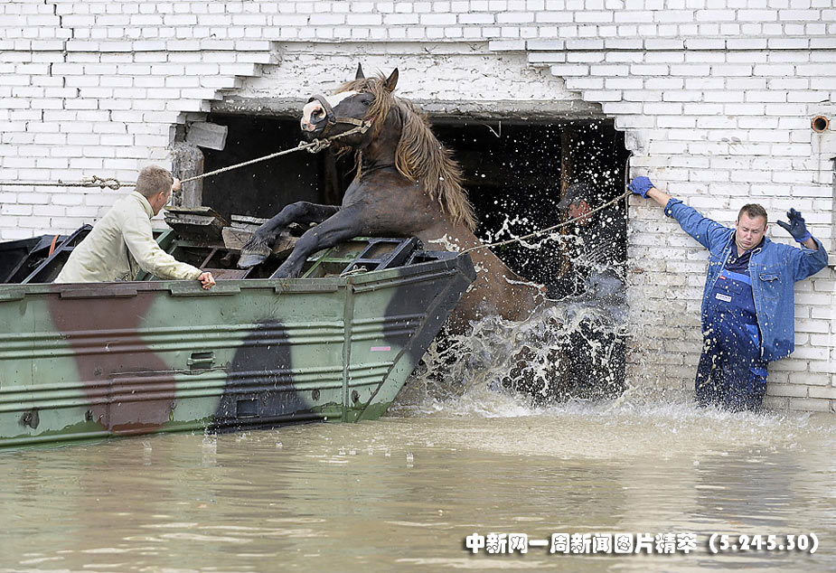 24日(周一),在波蘭Juliszew,農民正哄著一匹馬跳進兩棲車。由暴雨引發(fā)的洪水已在波蘭造成至少15人喪生。
