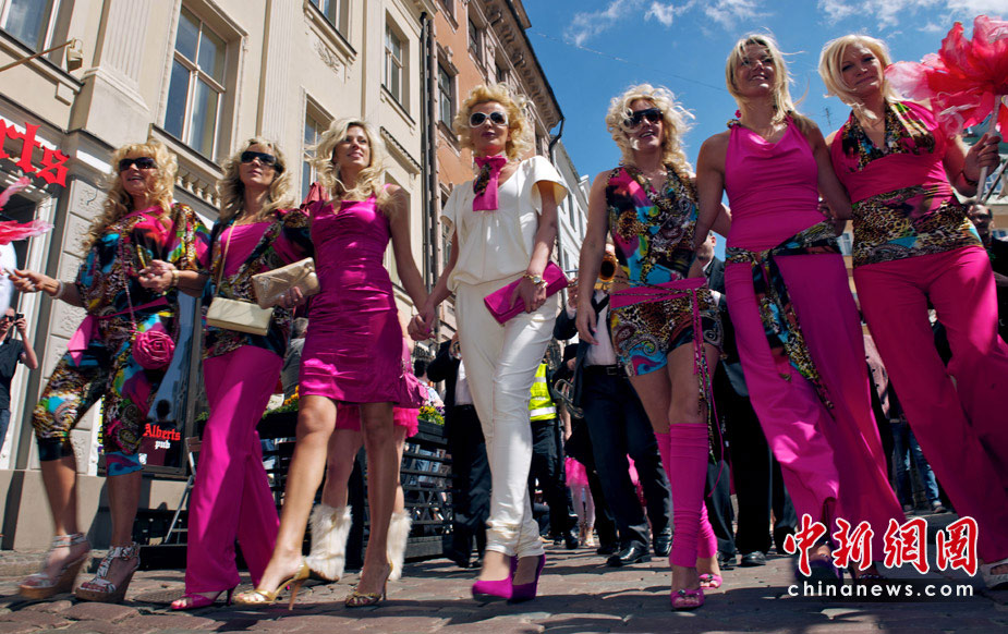 5月29日,在拉脫維亞首都里加,眾多金發(fā)美女身著艷麗裝扮在街頭游行,大秀嫵媚身材。