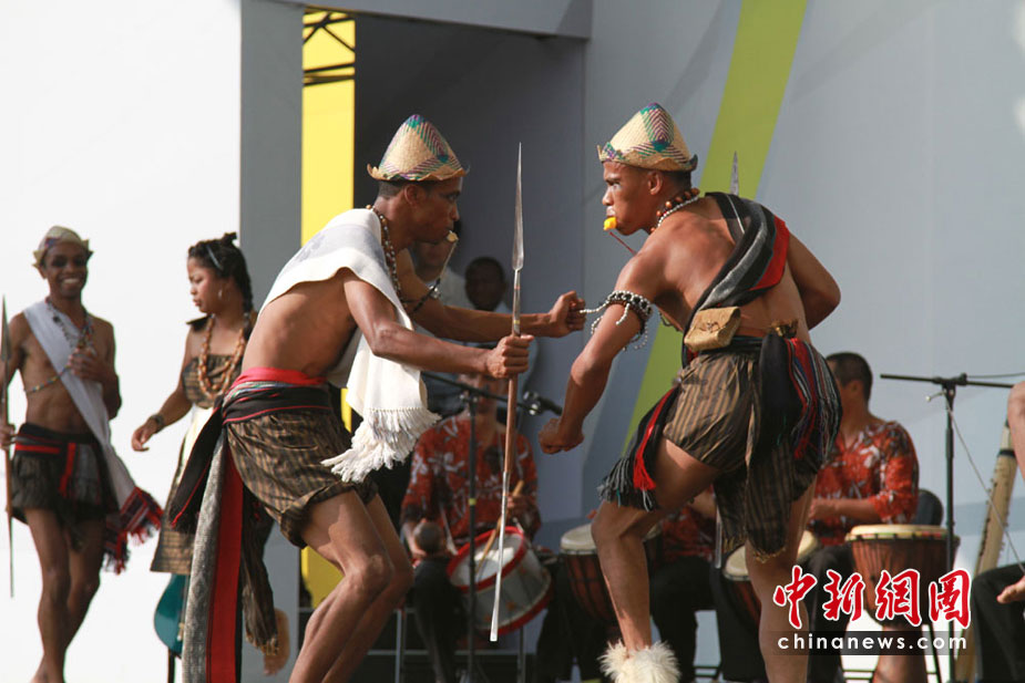 5月30日,馬達(dá)加斯加肯特思米諾歌舞團(tuán)在世博園非洲廣場表演比洛傳統(tǒng)儀式,逼真的神態(tài)、激情的表演,博得許多參觀者稱贊。當(dāng)天是馬達(dá)加斯加館日,世博中心內(nèi)舉行了其國家館日活動(dòng),馬方和中方代表共同出席。中新社記者 殷春永 攝