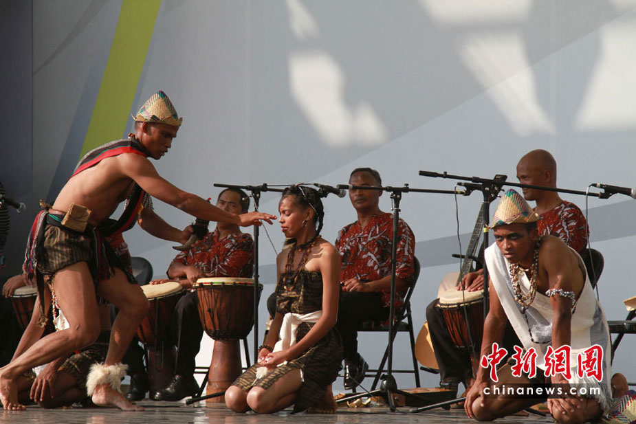 5月30日,馬達(dá)加斯加肯特思米諾歌舞團(tuán)在世博園非洲廣場(chǎng)表演比洛傳統(tǒng)儀式,逼真的神態(tài)、激情的表演,博得許多參觀者稱贊。當(dāng)天是馬達(dá)加斯加館日,世博中心內(nèi)舉行了其國(guó)家館日活動(dòng),馬方和中方代表共同出席。中新社記者 殷春永 攝