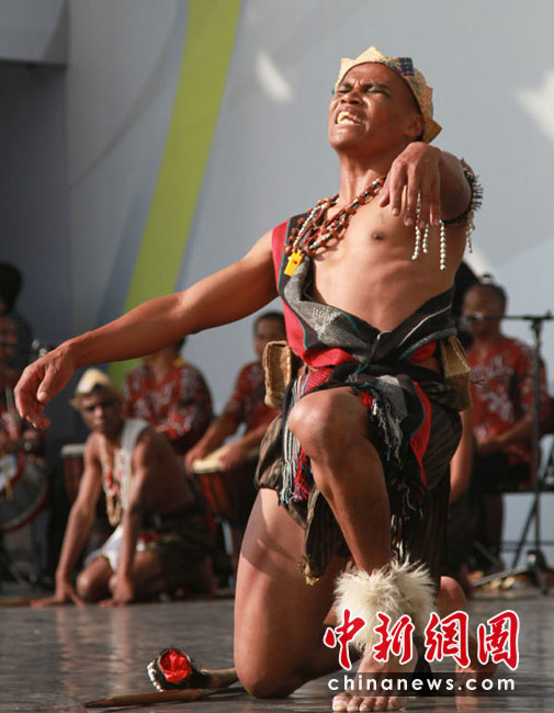 5月30日,馬達(dá)加斯加肯特思米諾歌舞團(tuán)在世博園非洲廣場表演比洛傳統(tǒng)儀式,逼真的神態(tài)、激情的表演,博得許多參觀者稱贊。當(dāng)天是馬達(dá)加斯加館日,世博中心內(nèi)舉行了其國家館日活動(dòng),馬方和中方代表共同出席。中新社記者 殷春永 攝
