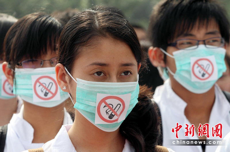 5月31日是第23個“世界無煙日”,今年的主題是:性別與煙草——抵制針對女性的市場營銷。吸煙有害健康早已成為不爭的事實。有關(guān)醫(yī)學(xué)研究表明,吸煙可導(dǎo)致心腦血管疾病、癌癥、慢性阻塞性肺病等多種疾病,已成為繼高血壓之后的全球第二號殺手。為了您的健康,請熄滅您手中的香煙。圖為5月29日西安大學(xué)生戴著無煙口罩開展控?zé)熜袆印T爸?攝