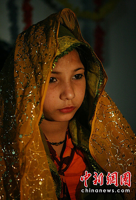 盡管在巴基斯坦童養(yǎng)媳是違法的,但這也是一個(gè)普遍存在的現(xiàn)象。近日,26歲的Shahir與12歲的Nasrin結(jié)為夫妻。Nasrin的爸爸是在兩年前去世的。因?yàn)榻?jīng)濟(jì)困難,Nasrin被迫出嫁。圖片來源:CFP