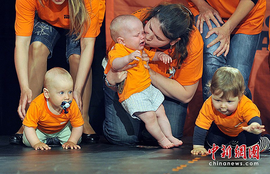 當?shù)貢r間5月31日,烏克蘭基輔舉行了寶寶爬行大賽。數(shù)十名嬰兒在母親的鼓勵下奮力向4米外的終點爬去。圖片來源:中國新聞網(wǎng)