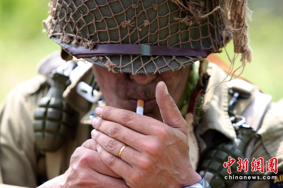 6月5日,諾曼底登陸66周年前夕,一批演員身著二戰(zhàn)時期美軍軍服,在法國諾曼底卡倫坦重現了這次著名的戰(zhàn)役。