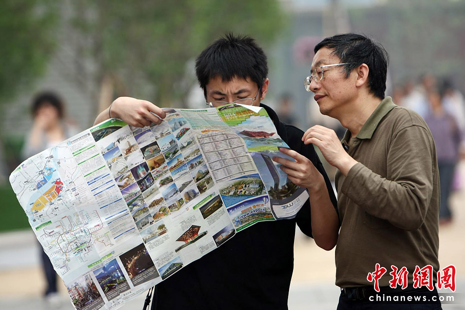截至6月5日19點(diǎn)30分,上海世博會(huì)累計(jì)參觀者已超過(guò)1000萬(wàn)人次。據(jù)悉,上海世博會(huì)的規(guī)劃用地為5.28平方公里,約242個(gè)國(guó)家和國(guó)際組織參展分布在浦東和浦西兩大區(qū)域。要想在這么大的地方找到自己想去的地方,那么世博地圖就是必須的裝備。圖為上海世博園內(nèi)游客正在地圖上尋找自己要去的地方。中新社記者 杜洋 攝
