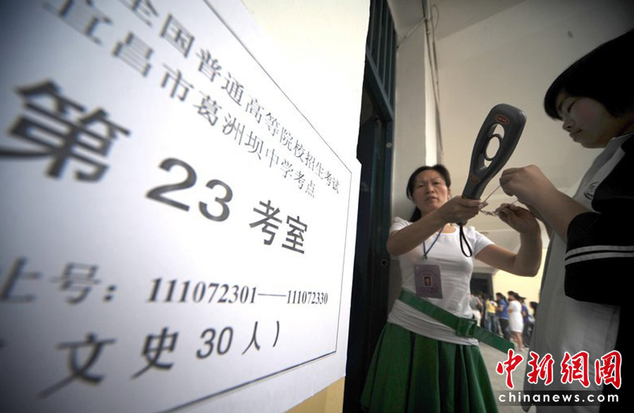 2010年全國(guó)高考6月7日日拉開(kāi)大幕,957萬(wàn)考生走進(jìn)考場(chǎng)。由于報(bào)名人數(shù)減少,而招生計(jì)劃增加,教育部預(yù)計(jì)今年全國(guó)高考平均錄取率將會(huì)增加近7%。6月6日下午,參加2010年高考的湖北宜昌考生走進(jìn)葛洲壩中學(xué)考點(diǎn)熟悉考場(chǎng),進(jìn)場(chǎng)前,監(jiān)考老師手持金屬探測(cè)儀器對(duì)考生一一進(jìn)行認(rèn)真的安全檢查。劉曙松/CFP