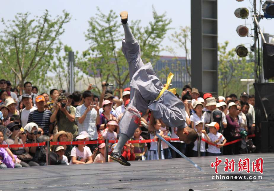 自5月1日開始,上海世博園D片區(qū)綜藝廣場每天都有少林寺功夫展演,受到世博參觀者的熱捧。中新社記者 殷春永攝