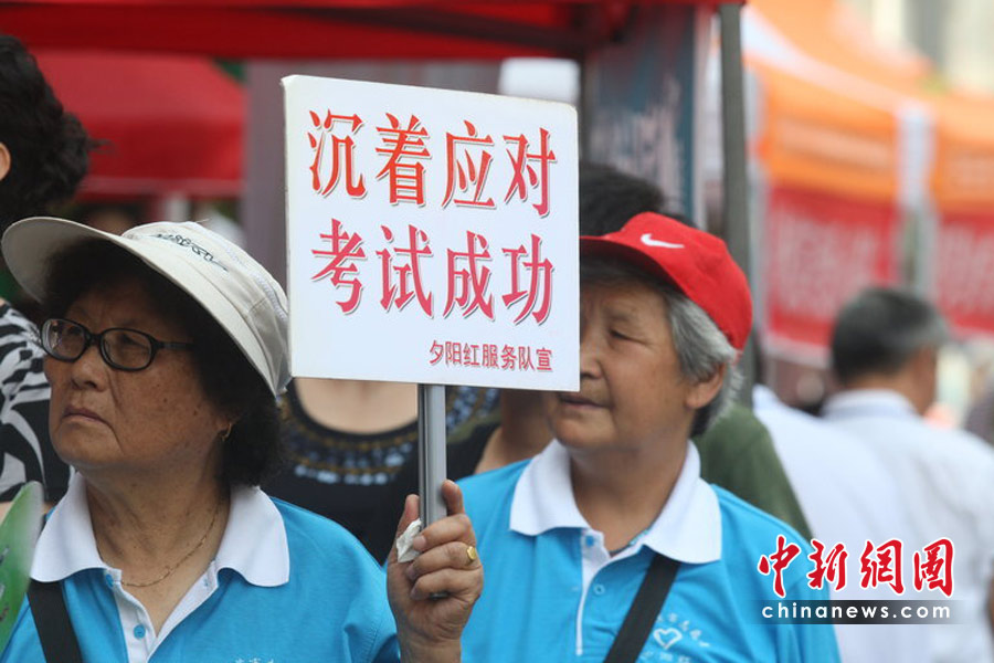 6月7日,為期兩天的2010年普通高等學(xué)校招生全國統(tǒng)一考試開考,全國將有957萬考生走進(jìn)考場。圖為在哈爾濱一考點(diǎn)外,夕陽紅服務(wù)隊(duì)的老人舉起牌子鼓勵(lì)考生。小剛 攝