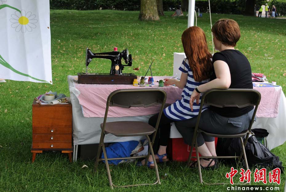 當?shù)貢r間2010年6月6日,英國倫敦舉行卡姆登綠色市集(Camden Green Fair),這是英國倫敦每年環(huán)保領域的“重頭戲”。本屆市集的主旨是要喚起大眾對環(huán)境問題的關注,選擇更加可持續(xù)發(fā)展的生活方式。據(jù)活動主辦方預計,本屆市集將吸引來自英國各地和世界各國的2萬多人參加。圖為一對母女在做手工。桌子上的老式縫紉機讓人有重回舊時光的感覺。Fiona/攝 Fiona 馬小剛/文