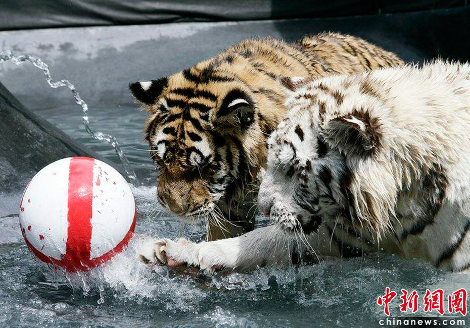 2010年6月7日,美國南卡羅來納州美特爾海灘,在世界杯即將開幕之際,一歲的小白虎Sundaram和孟加拉虎Mukti率先在水里上演了一出足球大戲。英格蘭隊(duì)首戰(zhàn)將對(duì)陣美國隊(duì),因此足球外側(cè)也被印上了英格蘭旗的標(biāo)志。cfp