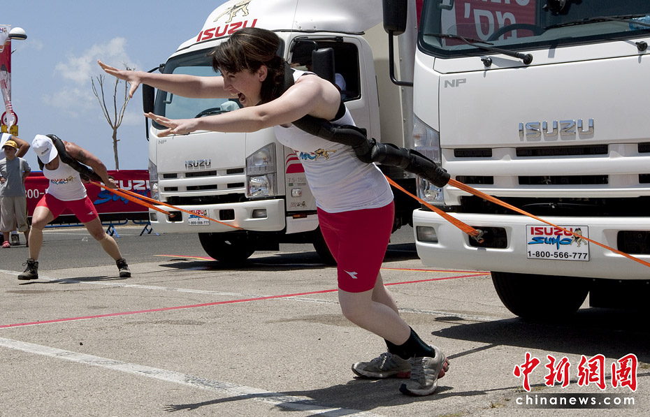 6月8日,以色列在海濱城市特拉維夫舉行了拉卡車大賽。比賽要求將一臺7.5噸的卡車拉到30米以外,用時最短者為勝者。該項賽事不但吸引了世界上眾多男性大力士,更有許多女性大力士出戰(zhàn)。圖片來源:中國新聞網(wǎng)
