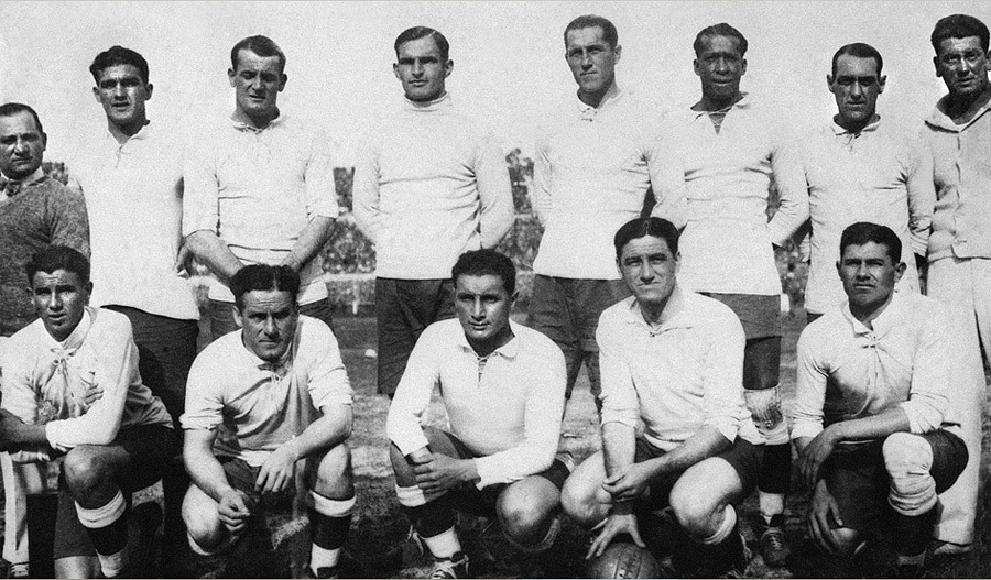 圖為首屆冠軍隊烏拉圭。第一屆世界杯參賽隊只有13支,包括4支歐洲球隊、8支南美洲球隊以及一支來自美國的代表隊,不過這屆賽事體現(xiàn)了當時世界足壇的最高水平。東道主烏拉圭隊4比2戰(zhàn)勝阿根廷奪得首屆冠軍,首都蒙得維的亞慶祝球隊奪冠的活動持續(xù)了幾天幾夜。為了紀念這場勝利,決賽后的第二天(7月31日)被定為全國性節(jié)日。