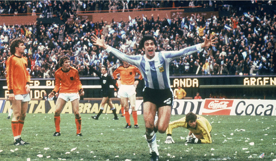 1978年,盡管荷蘭隊(duì)還是那么強(qiáng)大,但“全攻全守”在走下坡路,兩位劃時(shí)代的人物克魯伊夫和貝肯鮑爾退出各自國(guó)家隊(duì),阿根廷采用1962年巴西隊(duì)的4-3-3陣型,在河床體育場(chǎng)3比1擊敗荷蘭隊(duì)奪冠。 阿根廷的成功得益于主教練梅諾蒂的指揮以及一批球星的崛起。鐵門(mén)菲洛爾、隊(duì)長(zhǎng)帕薩雷拉、突破高手阿爾迪列斯。74年那屆阿根廷隊(duì)中只有肯佩斯和豪斯曼兩人入選78年陣容。當(dāng)然,最引人注目的是一頭長(zhǎng)發(fā)的肯佩斯,他是這屆世界杯的英雄……