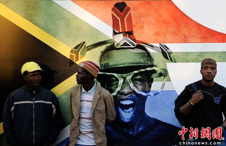 當(dāng)?shù)貢r(shí)間6月9日,民眾在南非約翰內(nèi)斯堡街頭的世界杯宣傳畫前,非洲大陸即將首次迎來(lái)足球世界杯。中新社發(fā) 廖攀 攝