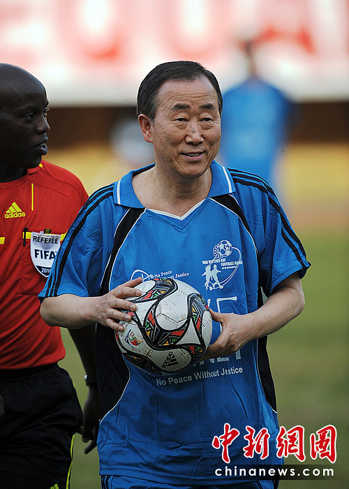 圖為2010年5月30日,聯合國秘書長潘基文在曼德拉國家體育場參加足球賽。