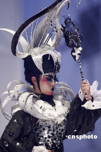 11月12日,“美麗盛典”2008中國(guó)國(guó)際時(shí)裝周彩妝造型設(shè)計(jì)大賽在北京舉行。大賽主題為“幻彩魔方”,結(jié)合國(guó)際色彩流行趨勢(shì),強(qiáng)調(diào)繽紛顏色的互相碰撞組合,就像魔方上的色塊,有趣而且多變,讓造型設(shè)計(jì)變得更加藝術(shù)。中新社發(fā) 盛佳鵬 攝