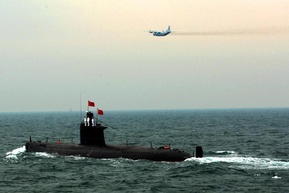 4月23日下午,為紀(jì)念中國(guó)人民解放軍海軍成立60周年而舉行的海上閱兵在青島附近黃海海域舉行。長(zhǎng)征6號(hào)、長(zhǎng)征3號(hào)核動(dòng)力潛艇和長(zhǎng)城218號(hào)、長(zhǎng)城177號(hào)常規(guī)動(dòng)力潛艇依次接受檢閱。 中新社發(fā) 宋吉河 攝