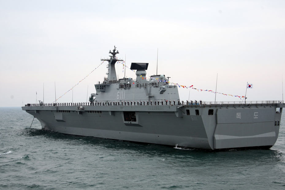 中國(guó)歷史上的首次多國(guó)海軍檢閱活動(dòng)四月二十三日下午在青島附近黃海海域舉行。中國(guó)國(guó)家主席、中央軍委主席胡錦濤乘閱兵艦“石家莊”號(hào)導(dǎo)彈驅(qū)逐艦,檢閱中國(guó)海軍的潛艇、水面艦艇、海軍航空兵和海軍陸戰(zhàn)隊(duì)等作戰(zhàn)兵種,并檢閱了來訪的十四個(gè)國(guó)家的二十一艘艦艇。圖為韓國(guó)“獨(dú)島”號(hào)兩棲攻擊艦。中新社發(fā) 張雷 攝
