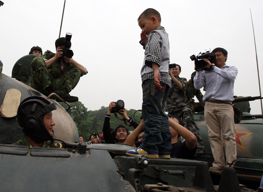 4月25日,汶川大地震幸存者“敬禮娃娃”郎崢一家來(lái)到成都軍區(qū)駐渝某部營(yíng)區(qū),感謝該部戰(zhàn)士在廢墟中救出郎崢的性命。2008年5月13日晨,3歲的郎崢被解放軍官兵從廢墟里救出后,躺在一塊小木板做的臨時(shí)擔(dān)架上,用他稚嫩的右手向8位抬著他的解放軍叔叔敬了個(gè)少先隊(duì)禮,他的舉動(dòng)引起社會(huì)各界高度關(guān)注,被媒體稱(chēng)為“敬禮娃娃”。圖為郎崢在營(yíng)區(qū)內(nèi)見(jiàn)到夢(mèng)寐以求的坦克,爬到坦克車(chē)上用一個(gè)軍禮向解放軍叔叔表示感謝。中新社發(fā) 郭晉嘉 攝
