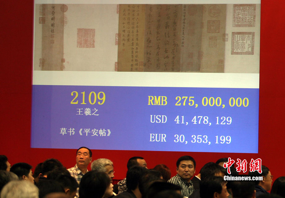 11月20日晚,在中國嘉德2010秋季拍賣會“秋光萬華——清代宮廷藝術集粹”專場中,王羲之草書《平安帖》以人民幣三億零八百萬成交。中新社 楊可佳 攝