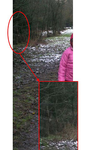 仔細(xì)看看圖上放大的區(qū)域,一個(gè)穿西服戴墨鏡的人看向了鏡頭