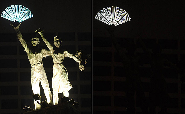 印度尼西亞雅加達(dá):3月28日,印度尼西亞首都雅加達(dá)的印尼環(huán)形廣場(chǎng)雕塑在參與“地球一小時(shí)”熄燈行動(dòng)前(左)和熄燈后(右)的對(duì)比情況。