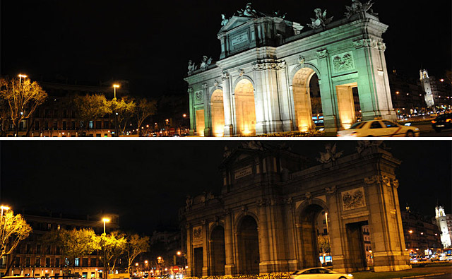 西班牙馬德里:3月28日,西班牙馬德里市中心的標(biāo)志性建筑阿爾卡拉門熄燈前后的對比情況。
