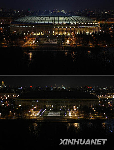 俄羅斯莫斯科:3月28日20時(shí)30分后,1980年莫斯科奧運(yùn)會(huì)主體育場盧日尼基體育場熄燈前和熄燈后的對比情況。魯金博 攝(圖片來源:新華網(wǎng))