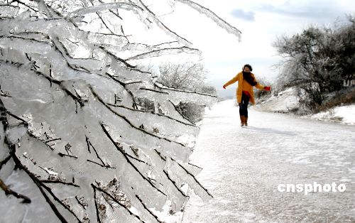 1月12日,雪后的江蘇連云港美不勝收。11日夜間連云港降下2008年第一場雪。連云港云臺山脈穿上一層白色冰衣,千姿百態(tài),冰掛和雪凇宛如美麗的童話世界。中新社發(fā) 王健民 攝