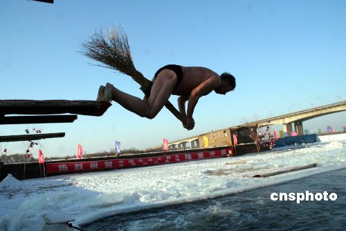 1月15日下午在哈爾濱公路大橋冬泳浴場(chǎng),國內(nèi)外游客激情觀看冬泳。冬泳愛好者用各種姿勢(shì)做跳水表演,引來游客的歡呼聲,冬泳運(yùn)動(dòng)員不怕今天零下20多度的嚴(yán)寒,為讓游客滿意就是再冷也要多游兩次,好讓游客高興而來盡興而走。中新社發(fā) 姚庭山 攝