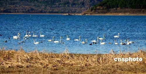 3月13日,一群白天鵝在京郊美麗的懷柔水庫暢游。由于京郊懷柔水清天藍(lán)生態(tài)環(huán)境優(yōu)美,吸引了80多只白天鵝在懷柔水庫或潛水覓食或水上嬉鬧或岸邊小息,成了水庫一道迷人的亮麗風(fēng)景。中新社發(fā) 卜向東 攝