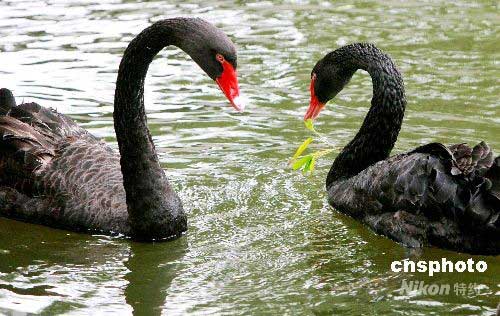 6月13日,一對黑天鵝在蘇州動物園池塘水面上結(jié)伴游弋。初夏時(shí)節(jié),氣溫漸暖,蘇州動物園里的黑天鵝們紛紛成雙結(jié)對,戲水游弋。中新社發(fā) 蘇秀 攝