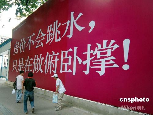 圖為房地產(chǎn)開發(fā)商在南京街頭打出的廣告牌。最近網(wǎng)絡(luò)上流行“我是出來做俯臥撐的”這句話,而南京某開放商也想借機炒作一把,在南京新街口附近立起一塊廣告牌“房價不會跳水,只是在做俯臥撐”。中新社發(fā) willis84 攝