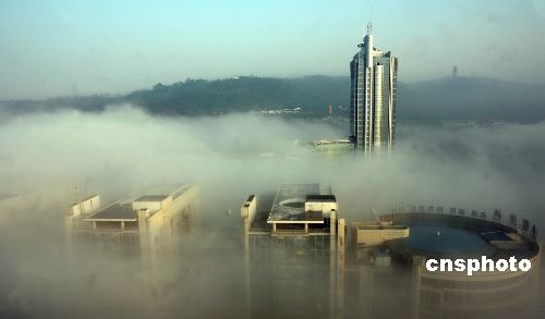 11月7日,重慶大霧,山城煙蒸霧繚,恍臨仙境。11月以來,重慶連續(xù)降雨數(shù)日,當(dāng)日一早天氣放晴,受冷空氣影響,山城出現(xiàn)大霧,高樓大廈云中林立,如登廣寒。中新社發(fā) 秦楓 攝 < 2008-11-07 18:45:20 >