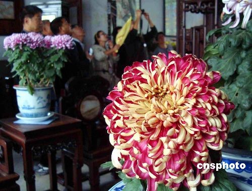 2008年11月6日,游客在蘇州獅子林觀賞菊花。正在蘇州古典園林獅子林舉辦的“2008蘇州園林系統(tǒng)菊花評比展”上,5000余盆千姿百態(tài)的菊花爭奇斗艷,令眾多中外游人陶醉其中,流連忘返。中新社發(fā) 王建康 攝