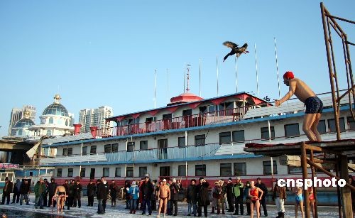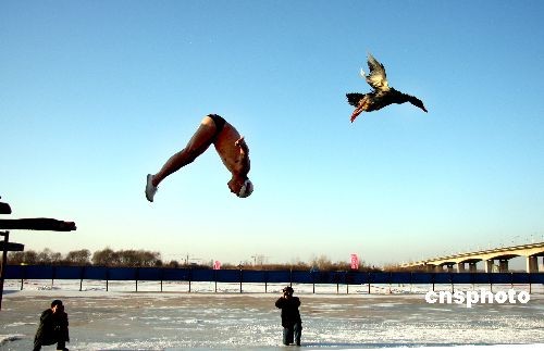 12月10日,在松花江上,黑龍江省冬泳協(xié)會新開設(shè)的冬泳池內(nèi),游客正在觀看人鴨共舞的跳水表演。游人掌聲不斷。據(jù)悉,今年入冬以來鴨子天天在冬泳池內(nèi)戲水游泳,冬泳人讓鴨子跳水是為了鍛煉它的飛行能力,也希望能成為冬泳的又一新看點。中新社發(fā) 姚庭山 攝