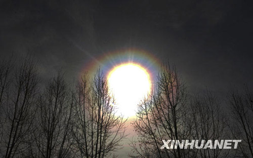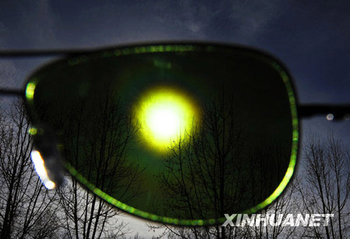 這是透過變色鏡片拍攝的日暈。新華社記者 普布扎西 攝