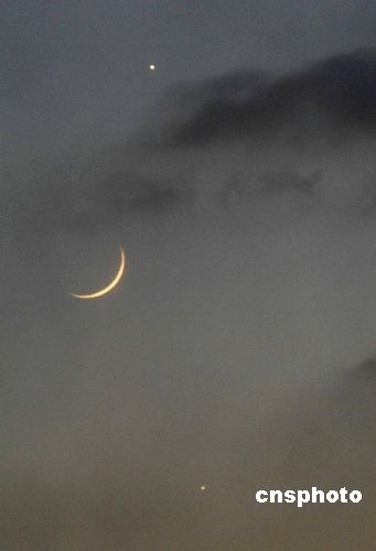 12月29日傍晚,在大連市西南方低空處,彎月的右下方有一顆土黃色星星,距離只1度左右,正在引導(dǎo)著彎月慢慢下沉。這就是2008年度最后一個(gè)有趣天象:木星會(huì)彎月相約人馬座。中新社發(fā) 劉德斌 攝