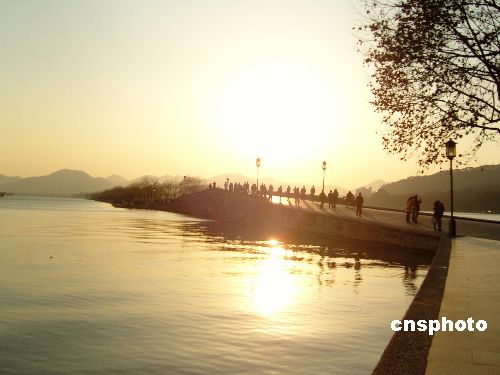 2009年1月1日,杭州西湖美景如畫,美麗的西湖被染成了金黃色,也吸引了眾多游人駐足。中新社發(fā) 王磊 攝